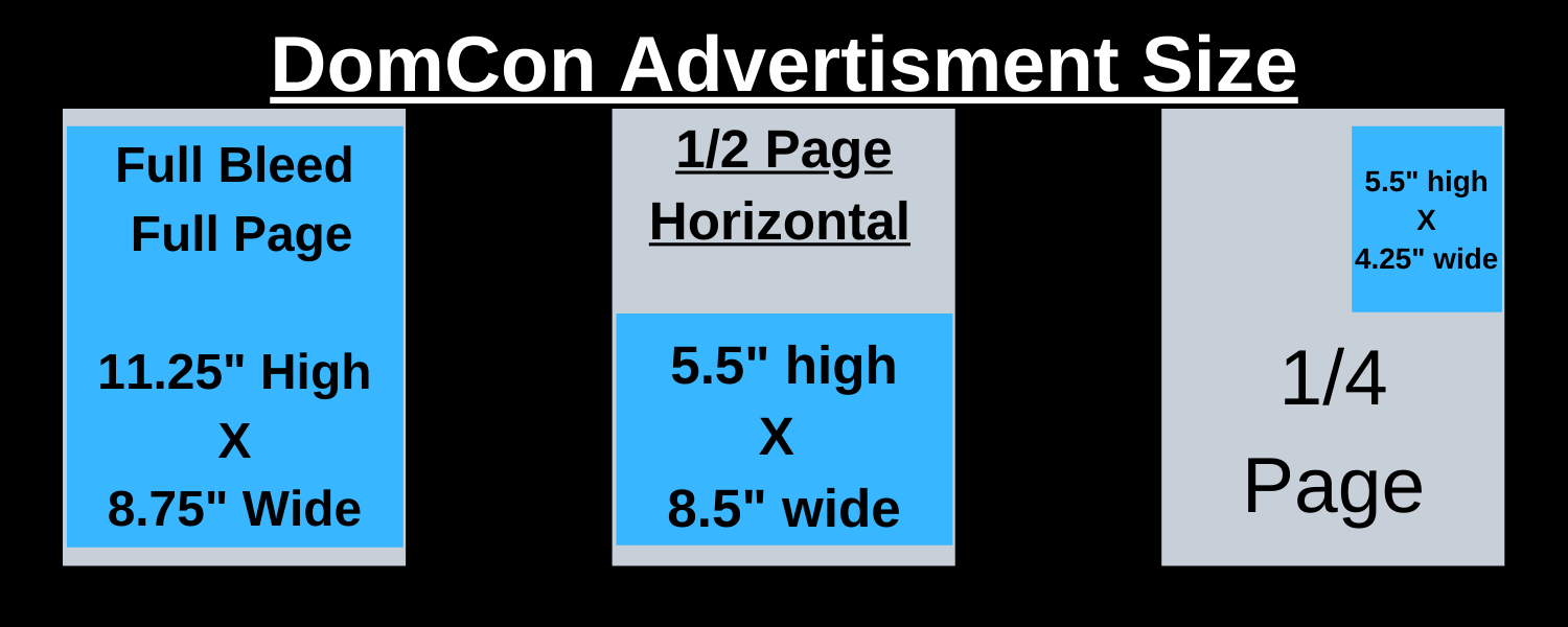 Full Color, Full Bleed 11.25" high X 8.75" wide) The DomCon Program is an 8 1/2" x 11" full color glossy booklet that feature booth information and locations, schedules of workshops and demos, profiles of The Special Guests and more. Fans keep the programs as souvenirs.